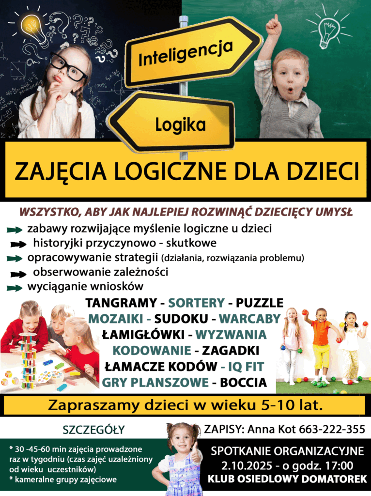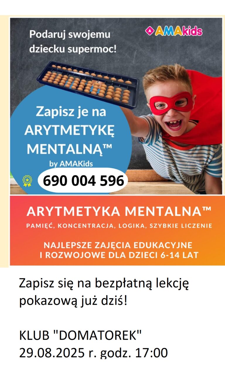 Klub „Domatorek” zaprasza dzieci na zajęcia taneczne i naukę języka angielskiego. Zapisy pod numerem telefonu 795 125 069 w godzinach 11-19. Planowane rozpoczęcie zajęć 15.09.2025 r.